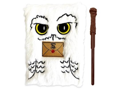 Plyšový zápisník s motivem Harryho věrné sovy Hedviky v pevné vazbě a s propiskou ve tvaru hůlky, formát A5 s 80 listy.