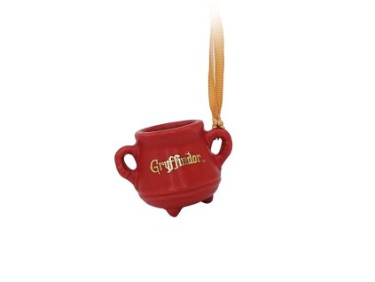 Ceramic Christmas ornament in the shape of a green cauldron with the Gryffindor crest, hand-painted, with hanging ribbon.