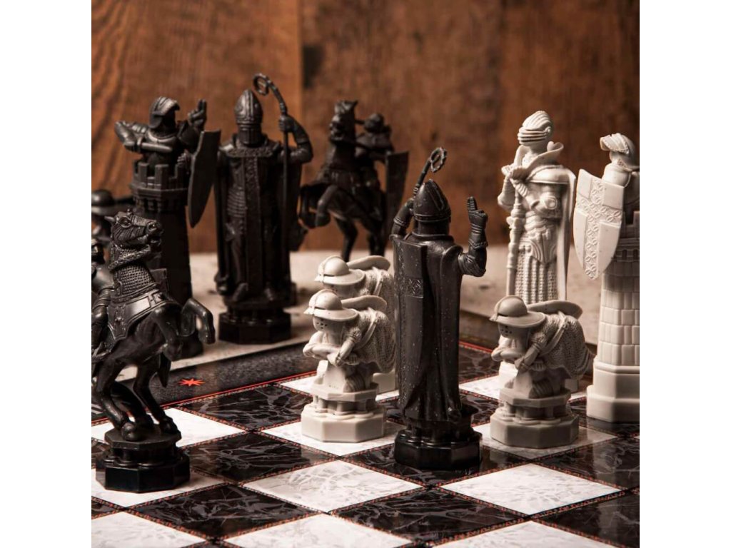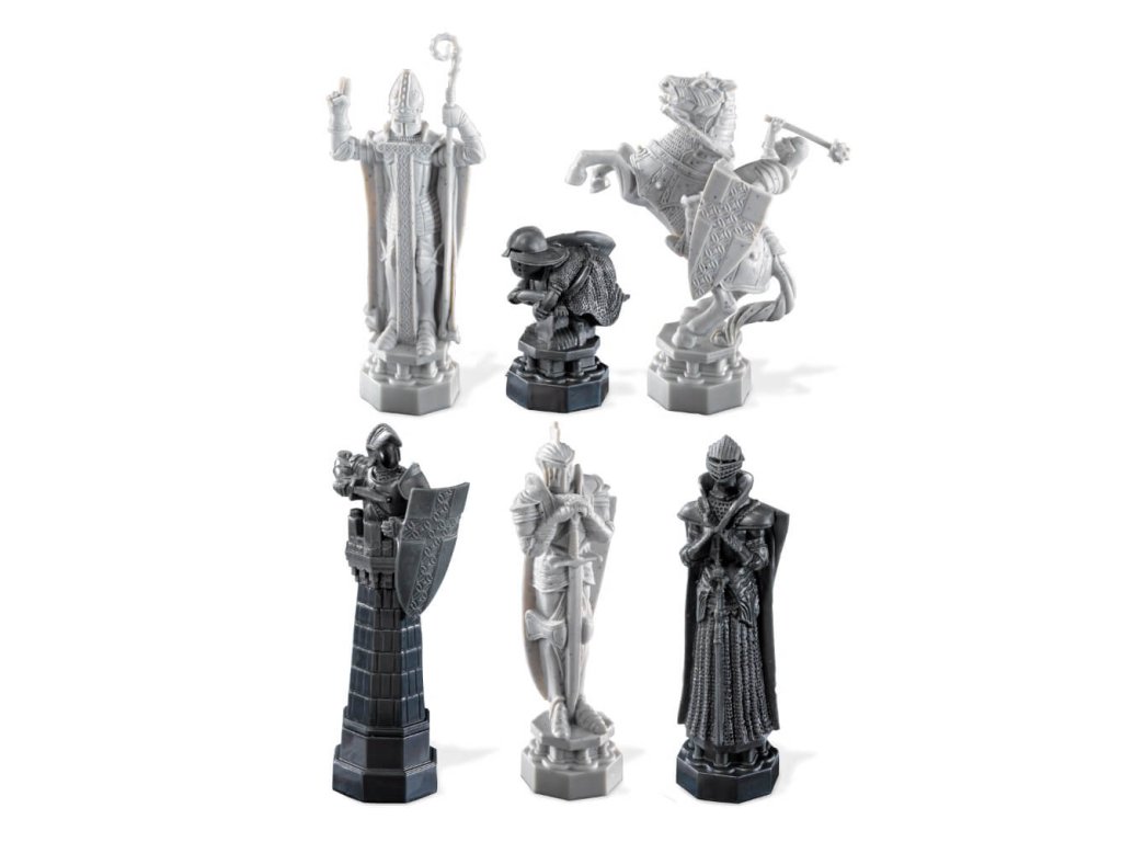 Celá sada 32 šachových figurek je vyrobena z ručně zpracované pryskyřice s povrchovou úpravou zachycující texturu kamene z filmové předlohy: