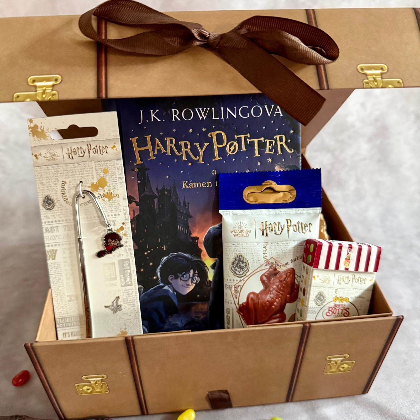 Harry Potter a Kámen mudrců - Dárková sada Harry obsahuje české vydání knihy Harry Potter a Kámen mudrců (Albatros) dárkově zabalenou v originálním Bradavickém kufříku s mašlí, lístek na Bradavický expres, záložku do knihy, čokoládovou žabku se sběratelskou kartičkou a Bertíkovy fazolky 1000x jinak. Zvýhodněná cena 949 Kč místo 1 070 Kč při nákupu položek zvlášť. Sestaveno světkouzel.com z officiálně licencovaných produktů Warner Bros.