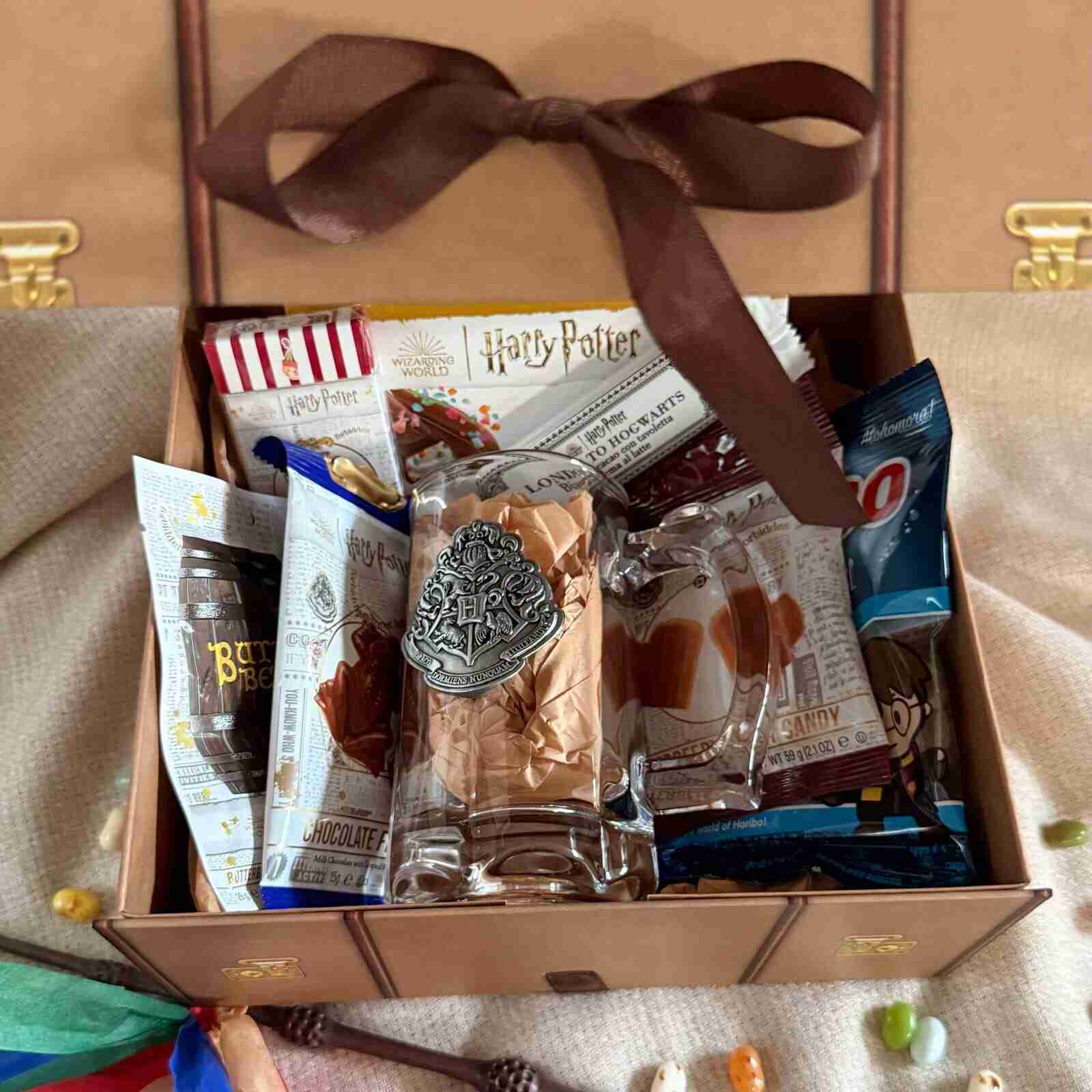 V Bradavickém kufříku s velkou mašlí najdete sklenici půlitr Máslový ležák, čokoládovou žabku, Bertíkovy fazolky 1000x jinak, čokoládky Moudrý klobouk, Haribo Harry Potter, sušenku s čokoládou Bradavický express, bonbónky Máslový ležák, Bertíkovy fazolky famfrležák a vlastní Bradavický kufřík s mašlí. Rozměry dárkového kufříku jsou 24 × 22 × 10 cm.