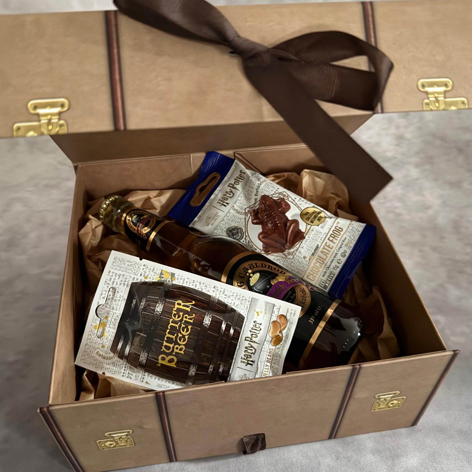 V Bradavickém kufříku najdete pravý nápoj Máslového ležáku, bonbónky s příchutí Máslového ležáku a čokoládovou žabku. Dárková sada Harry Potter Máslový ležák je oficiálně licencovaným produktem.