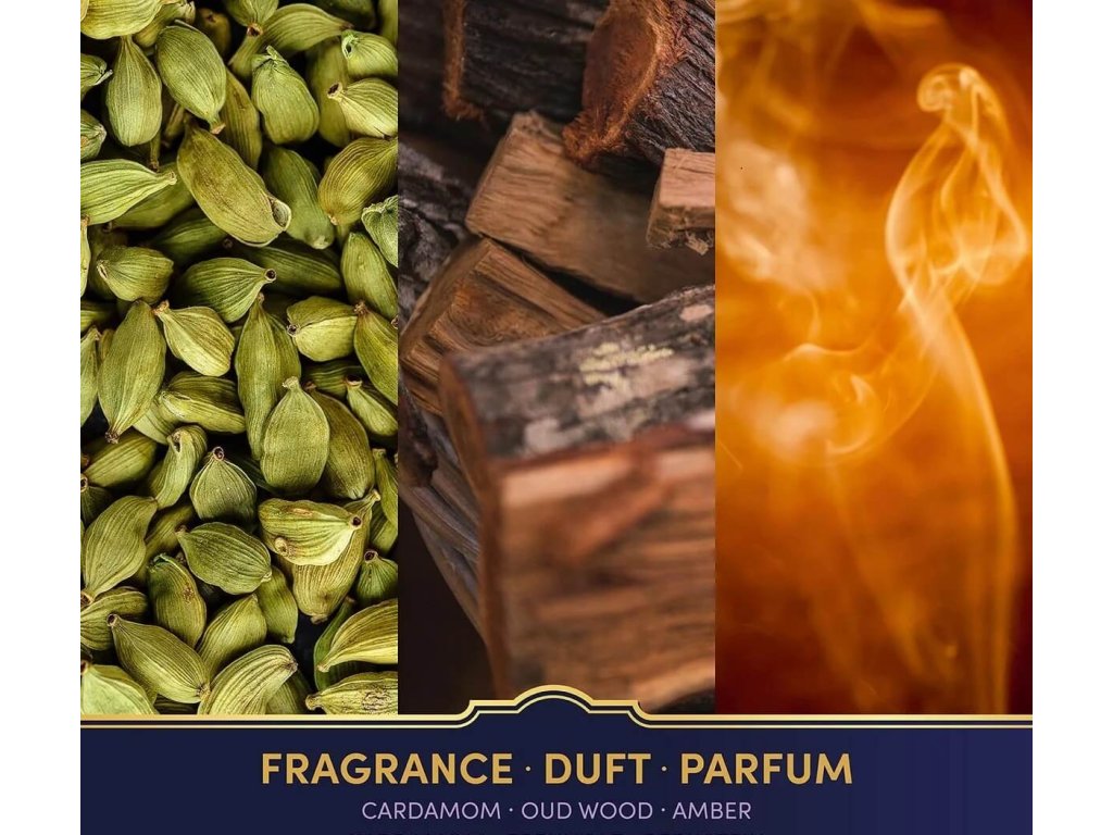 The base is warm and rich, blending guaiac wood, vanilla, coconut, amber, caramel, sandalwood, oud and tonka bean for a deep and elegant scent.