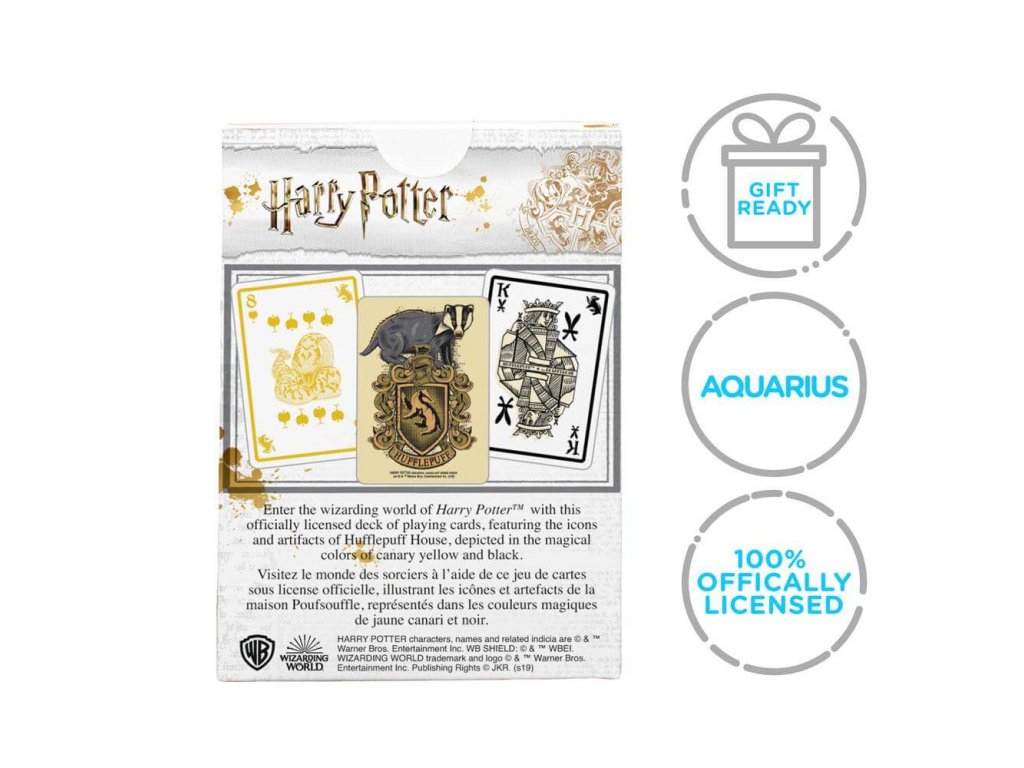 The cards are carefully stored in a durable box featuring Hufflepuff designs. Hufflepuff playing cards are an officially licensed product.