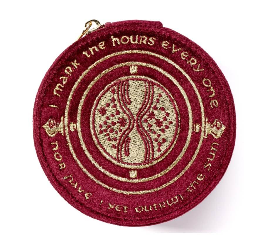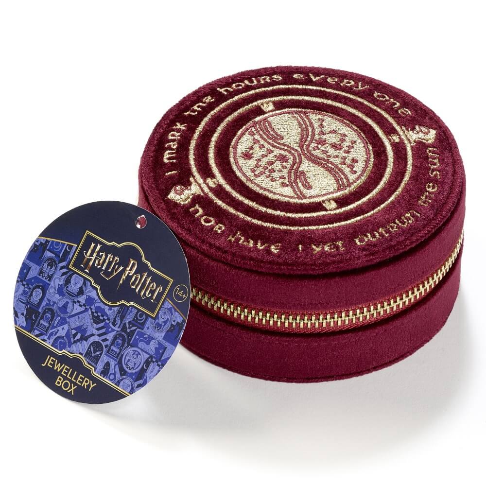 Harry Potter Jewellery Box - Time Turner is an officially licensed luxury burgundy velvet jewellery box by The Carat Shop featuring an embroidered Time Turner. 11cm diameter, compartments for rings, necklaces and earrings, secure zip closure. Material: 100% polyester.
