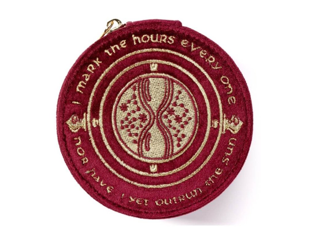- Surface: luxury burgundy velvet with embroidered Time Turner