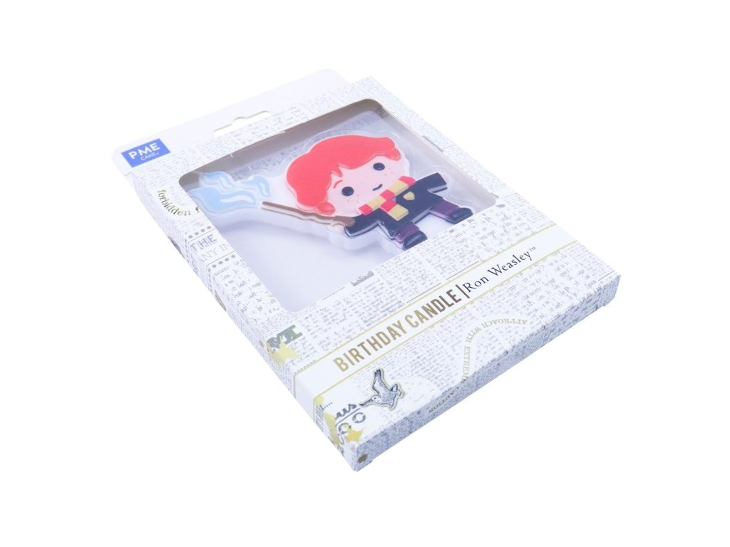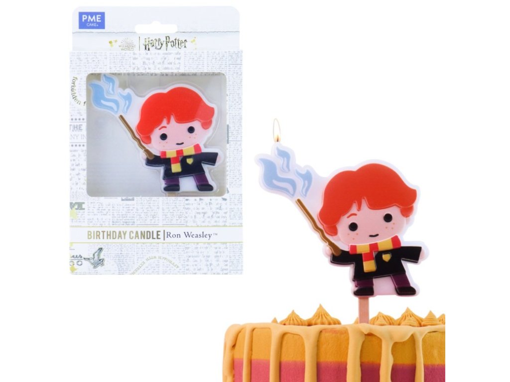 Svíčka Ron Weasley je vytvořena z odolného parafínového vosku a zachycuje Ronovy typické rysy – zrzavé vlasy, bradavickou uniformu i kouzelnickou hůlku. Knot je umístěn v oblasti hůlky, aby nebyla narušena podoba postavy. S rozměry 10 × 8 cm (bez stojánku) se stane výrazným a veselým prvkem každého Harry Potter dortu.