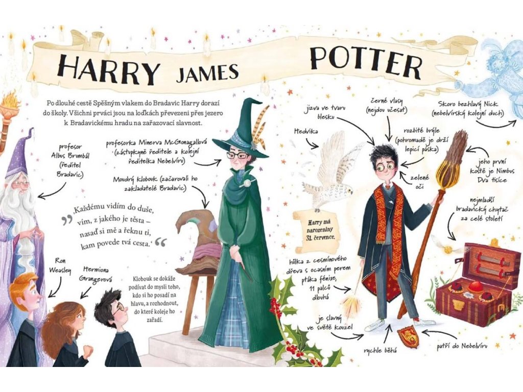 Objevte kouzelný svět J.K. Rowlingové prostřednictvím Harry Potter Potterovského průvodce – nádherně ilustrované knihy, která vás provede životem chlapce, jenž přežil. Sledujte Harryho od jeho dětství v přístěnku pod schody až po první kroky do Bradavic, kde se setká s přáteli, kouzly a temnými silami, které formují jeho osud. Tato kniha je ideální pro malé čtenáře, kteří s Harrym teprve začínají, i pro zkušené kouzelníky, kteří chtějí rozšířit svou sbírku o magický klenot.