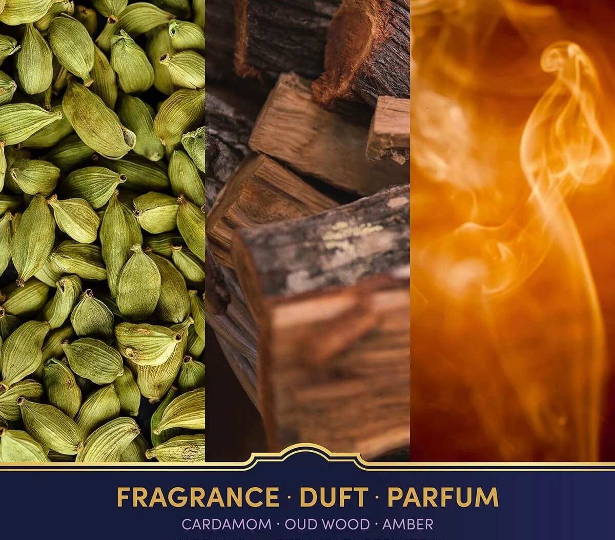 Základ vůně je bohatý a hřejivý, složený z guajakového dřeva, vanilky, kokosu, ambry, karamelu, santalového dřeva, oudu a tonka bobů. Výsledkem je hluboká a elegantní vůně, ideální pro celoroční použití.